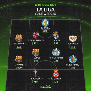 3月3日讯 西甲第26轮比赛战罢,WhoScored列出了本轮最佳阵容,亚马尔领衔。WhoScored西甲第26轮最佳阵...