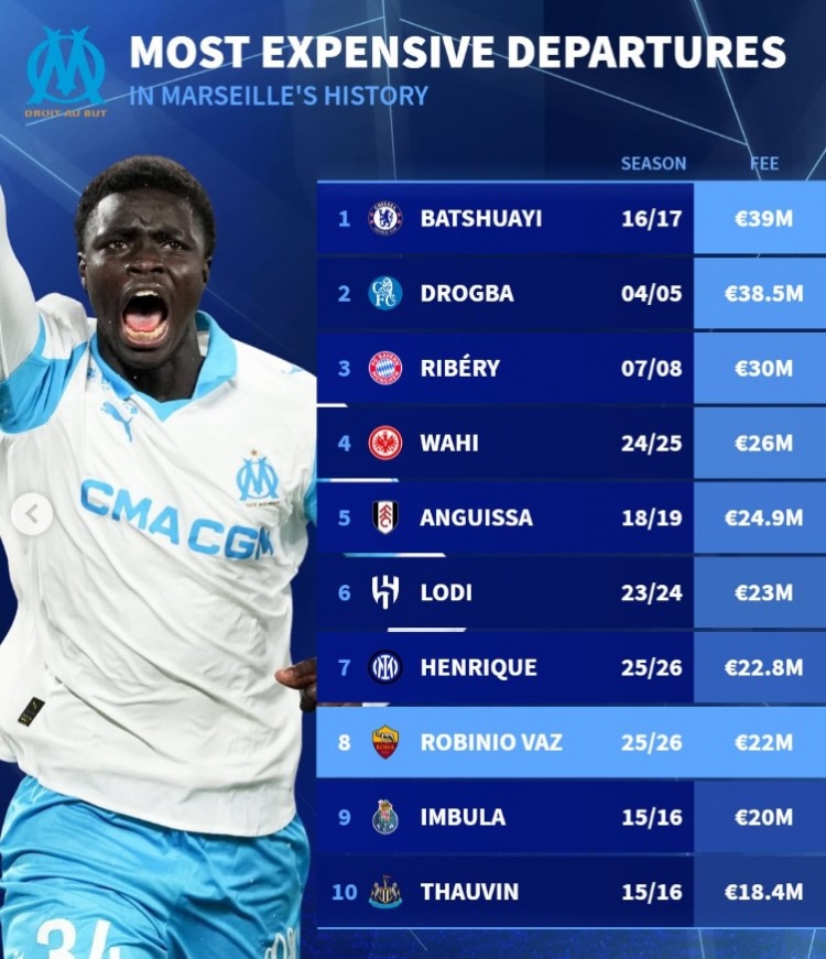 1月15日讯 罗马已经官宣引进马赛18岁中锋瓦斯,《转会市场》也统计了马赛队史最贵转出情况,巴舒亚伊居首。
